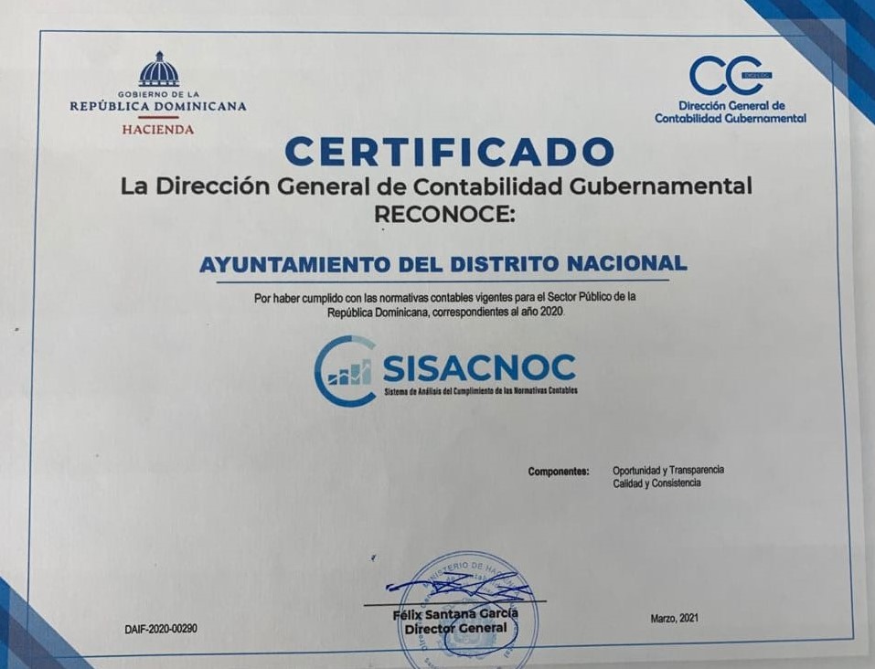 Santo Domingo:- La Alcaldía del Distrito Nacional (ADN) recibió de la Dirección General de Contabilidad Gubernamental del Ministerio de Hacienda una certificación de buenas prácticas por haber cumplido con las normativas contables vigentes para el sector público en la República Dominicana.