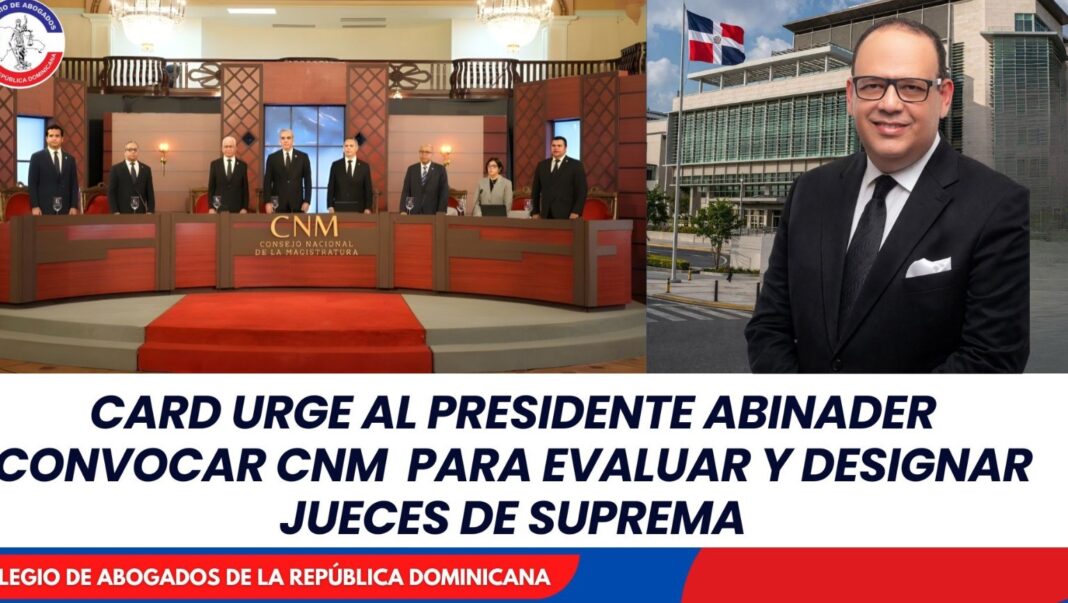Santo Domingo: – El Colegio de Abogados de la República Dominicana (CARD) pidió al presidente de la República, Luis Abinader, en su condición de presidente del Consejo Nacional de la Magistratura (CNM), a convocar de manera urgente a ese órgano constitucional para iniciar el proceso de evaluación y selección de los nuevos integrantes de la Suprema Corte de Justicia (SCJ).