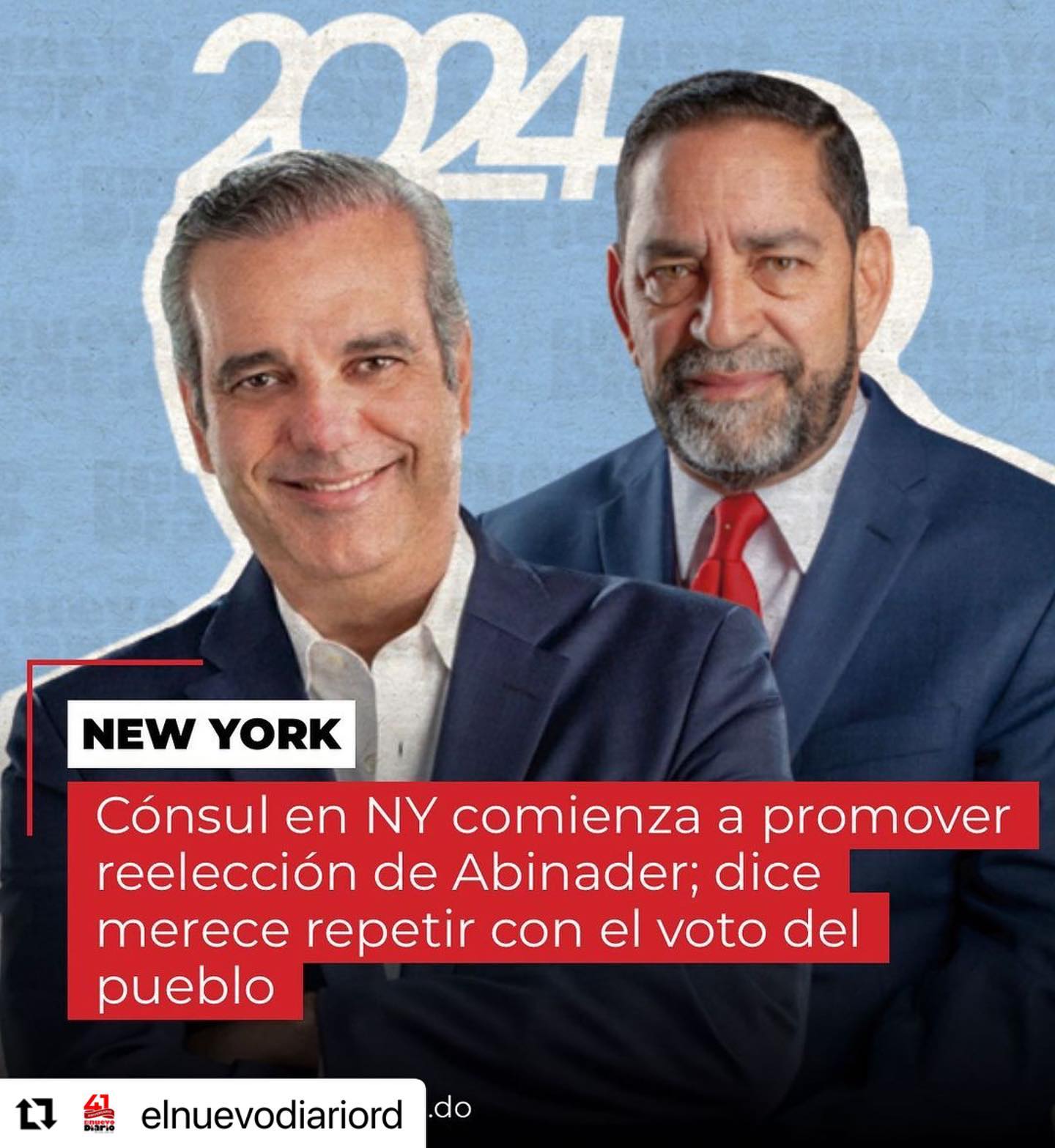 Santo Domingo: – El cónsul general de República Dominicana en la ciudad de Nueva York, Eligio Jáquez (@eligiojaquez), promueve por primera la vez la reelección del presidente Luis Abinader (@luisabinader) para elecciones presidenciales 2024, dijo que “por sus ejecutorias el mandatario merece repetir en el Palacio Nacional”.