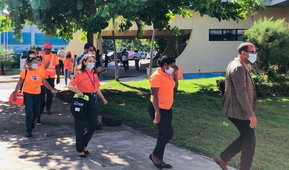 Como estaba previsto, al sonar las sirenas a las 10:00 de la mañana, el organismo naranja ejecutó las evacuaciones del edificio de la Comisión Nacional de Emergencias (CNE), que aloja la Defensa Civil, Oficina Nacional de Evaluación Sísmica y Vulnerabilidad de Infraestructuras y Edificaciones (Onesvie) y el Centro de Operaciones de Emergencias (COE); así como sus demás direcciones provinciales.
