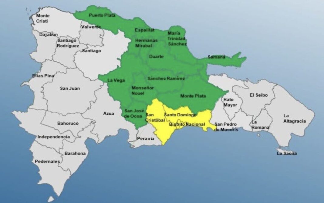 En tanto, en alerta verde figuran Puerto Plata, María Trinidad Sánchez, Espaillat, Hermanas Mirabal, Duarte, La Vega, Sánchez Ramírez, Samaná, Monseñor Nouel, San José de Ocoa y Monte Plata.