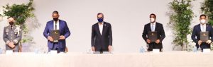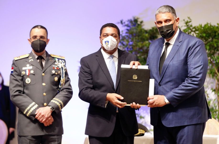 Santo Domingo:- El Presidente Luis Abinader encabezó hoy el Plan Municipal de Seguridad Ciudadana, acto en que el secretario General de la Liga Municipal Dominicana (LMD), Víctor D´Aza, entregó este martes al ministro de Interior y Policía, Jesús Vásquez una lista de 500 armas de fuego, que estuvieron en poder de exfuncionarios municipales y recuperada por la institución municipalísta.