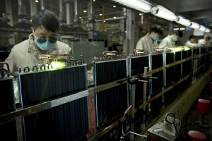 En esta foto del 24 de febrero de 2017, los trabajadores de una fábrica usan antorchas de gas en unidades de condensadores de aire acondicionado en una línea de montaje en una fábrica de Haier en Jiaozhou, cerca de Qingdao, en la provincia de Shandong, este de China. El último aumento de aranceles del presidente estadounidense, Donald Trump, sobre los productos chinos entró en vigencia el viernes 10 de mayo de 2019, y Beijing dijo que tomaría represalias, intensificando una batalla por las ambiciones tecnológicas de China y otras tensiones comerciales. (Foto AP / Mark Schiefelbein)