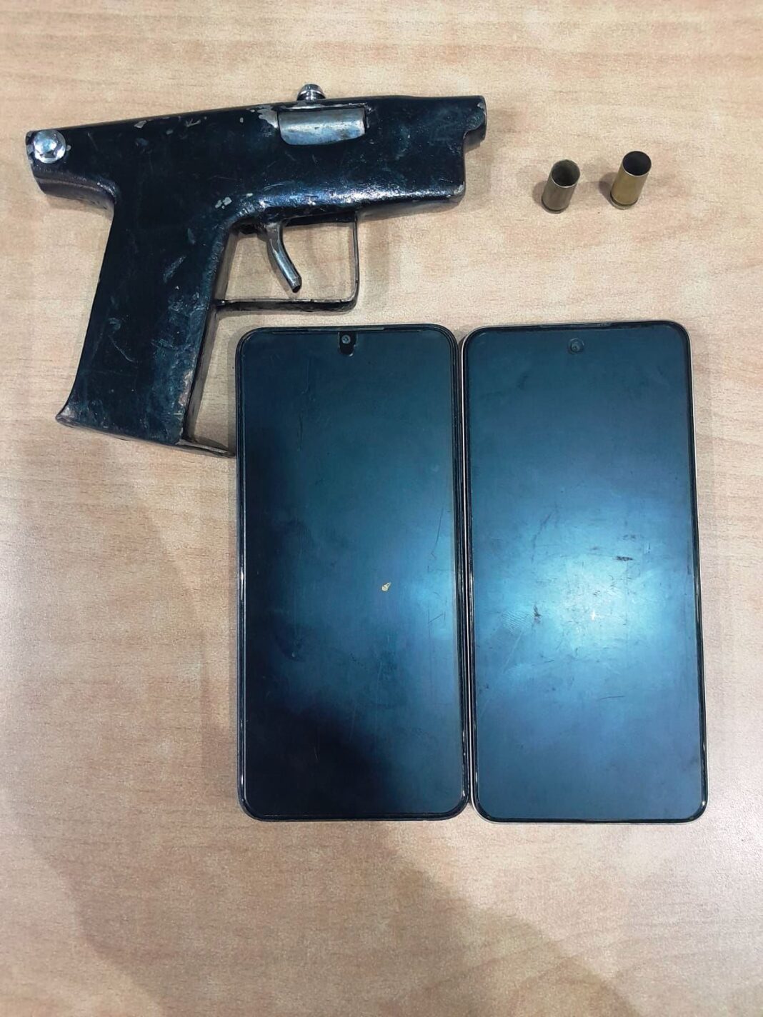 Durante la inspección, los agentes ocuparon un arma de fabricación artesanal tipo “chilena”, color negro, dos casquillos calibre 9mm, así como dos teléfonos celulares, de distintas marcas.