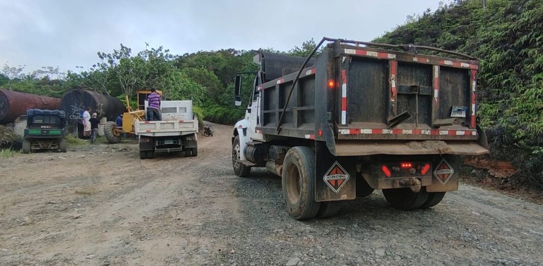 Con camiones, tractores, grédars, palas mecánicas y otros equipos y maquinarias facilitados y rentados por la comunidad, productores agrícolas y empresarios de la zona de Naranjo Dulce, realizan la reparación del camino principal, antes de llegar al río Boba, pese a que la obra que está aprobada, pero se mantiene paralizada hace ocho meses, lo que les imposibilita llevar a la ciudad la producción.