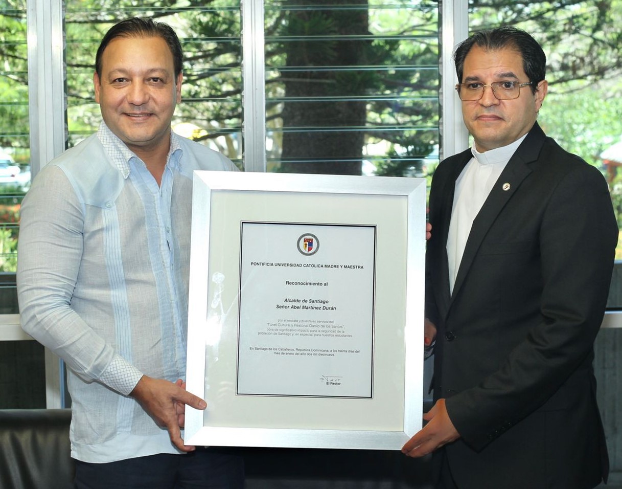 Santiago: – La Pontificia Universidad Católica Madre y Maestra, PUCAMAIMA, hizo entrega de un especial reconocimiento al alcalde Abel Martínez, por el rescate y puesta en servicio del “Túnel Cultural y Peatonal Danilo de los Santos”, que de acuerdo al alto centro de estudios, es una obra de significativo impacto para la seguridad de la población y en especial para sus estudiantes.