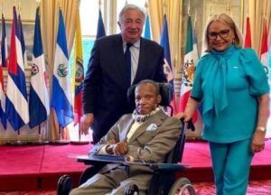 Gerard Larcher, presidente del Senado de Francia (2020), junto la embajadora dominicana en Francia, Rosa Hernández de Grullón, en ocasión del reconocimiento realizado allí. FOTO: suministrada por el taller del maestro
