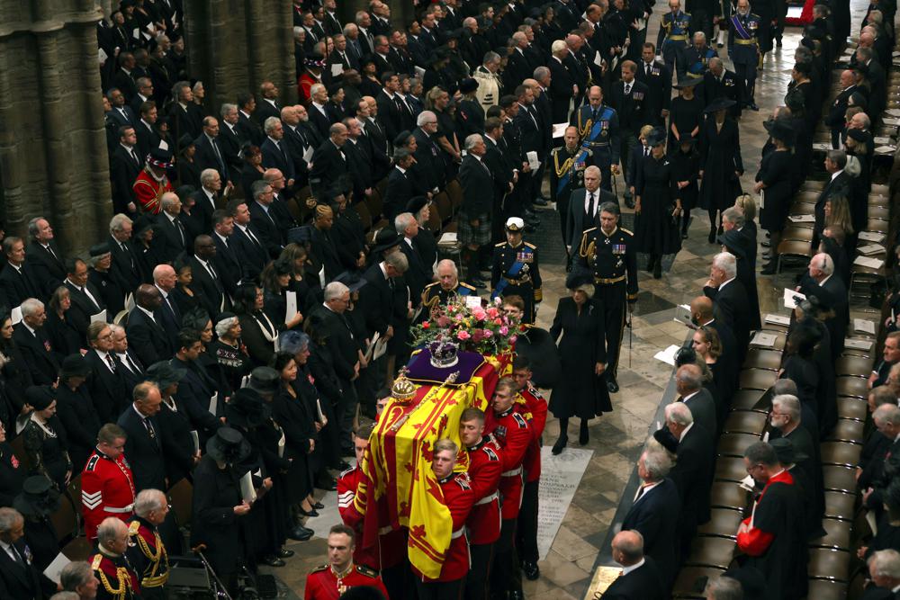 En un país conocido por la pompa y el boato, el primer funeral de estado desde el de Winston Churchill estuvo lleno de espectáculo: 142 marineros de la Marina Real llevaron el carro de armas que llevaba el ataúd de Isabel a la Abadía de Westminster, con el rey Carlos III y sus hijos, los príncipes William y Harry, caminando atrás mientras tocaban los gaiteros. Los portadores del féretro llevaron el ataúd a la abadía, donde unas 2.000 personas, desde líderes mundiales hasta trabajadores de la salud, se reunieron para llorarla. Antes del servicio, una campana sonó 96 veces, una vez por minuto por cada año de su vida.