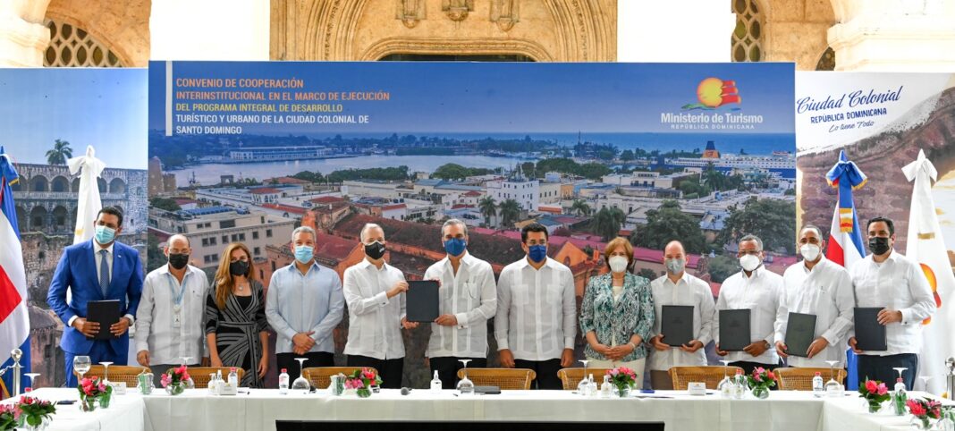 Santo Domingo:-  El presidente Luis Abinader y el ministro de Turismo, David Collado, encabezaron la firma de un acuerdo entre el MITUR y más de seis instituciones del Estado y del sector privado para la ejecución del Programa Integral de Desarrollo Turístico y Urbano de la Ciudad Colonial de Santo Domingo, con una inversión de 90 millones de dólares, a través de un financiamiento del Banco Interamericano de Desarrollo (BID).