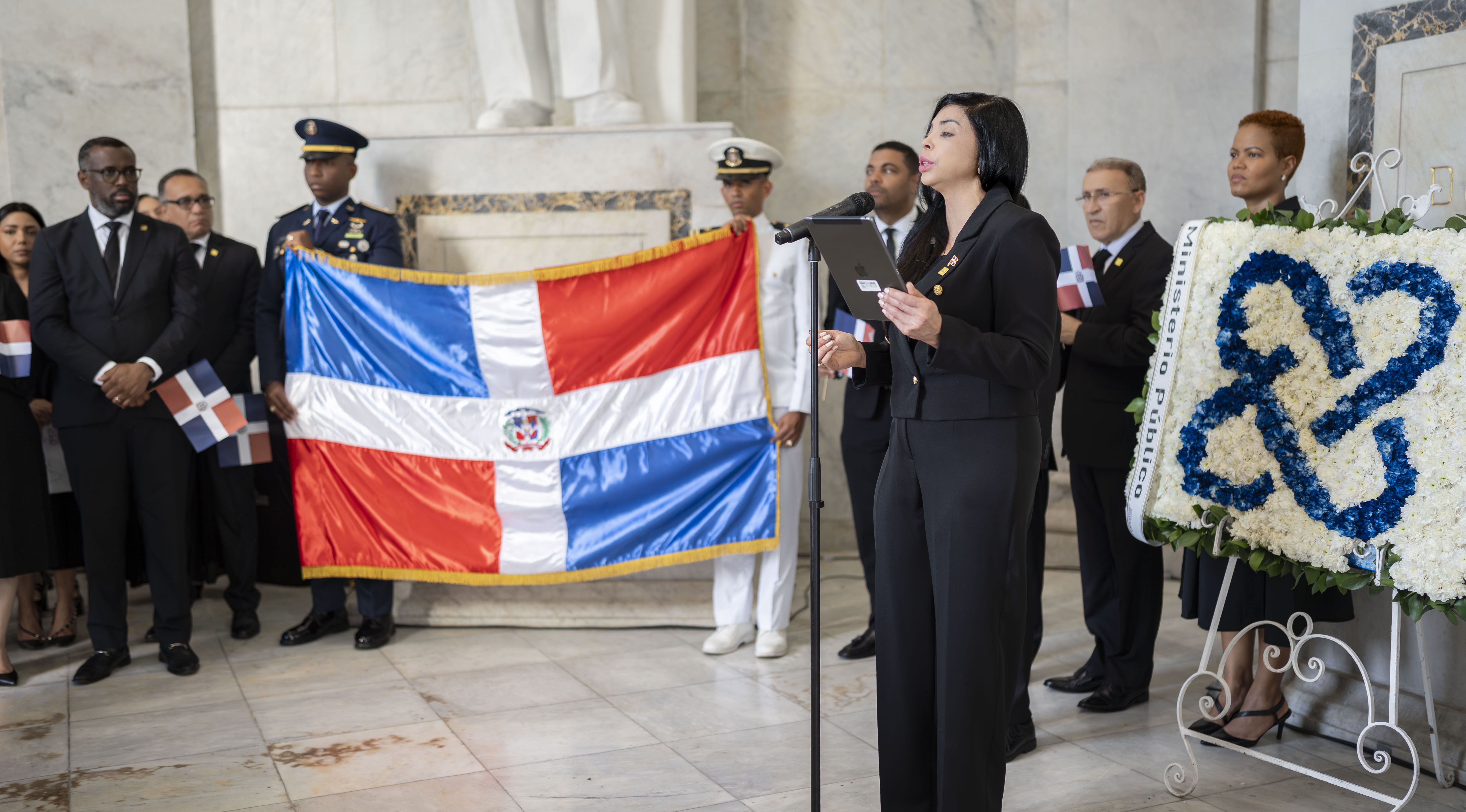 “Hoy vengo a proponerles un cambio de paradigma, una transformación profunda para que la sociedad perciba al Ministerio Público como: un Arquitecto de la Paz Social”, dijo la procuradora general al pronunciar un discurso durante un acto de izamiento de la Bandera Nacional en el Altar de la Patria con motivo del Día del Ministerio Público y del natalicio del patricio Francisco del Rosario Sánchez, primer procurador fiscal de la República Dominicana.
